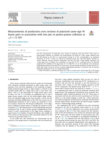 Résumé : The first measurements of production cross sections of polarized same-sign W±W± boson pairs in proton-proton collisions are reported. The measurements are based on a data sample collected with the CMS detector at the LHC at a center-of-mass energy of 13TeV , corresponding to an integrated luminosity of 137fb−1 . Events are selected by requiring exactly two same-sign leptons, electrons or muons, moderate missing transverse momentum, and two jets with a large rapidity separation and a large dijet mass to enhance the contribution of same-sign W±W± scattering events. An observed (expected) 95% confidence level upper limit of 1.17 (0.88) fbis set on the production cross section for longitudinally polarized same-sign W±W± boson pairs. The electroweak production of same-sign W±W± boson pairs with at least one of the W bosons longitudinally polarized is measured with an observed (expected) significance of 2.3 (3.1) standard deviations.