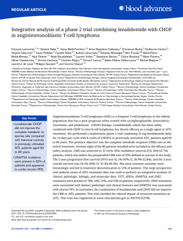 Résumé : Angioimmunoblastic T-cell lymphoma (AITL) is a frequent T-cell lymphoma in the elderly population that has a poor prognosis when treated with cyclophosphamide, doxorubicin, vincristine, and prednisone (CHOP) therapy. Lenalidomide, which has been safely combined with CHOP to treat B-cell lymphoma, has shown efficacy as a single agent in AITL treatment. We performed a multicentric phase 2 trial combining 25 mg lenalidomide daily for 14 days per cycle with 8 cycles of CHOP21 in previously untreated AITL patients aged 60 to 80 years. The primary objective was the complete metabolic response (CMR) rate at the end of treatment. Seventy-eight of the 80 patients enrolled were included in the efficacy and safety analysis. CMR was achieved in 32 (41%; 95% confidence interval [CI], 30%-52.7%) patients, which was below the prespecified CMR rate of 55% defined as success in the study. The 2-year progression-free survival (PFS) was 42.1% (95% CI, 30.9%-52.8%), and the 2-year overall survival was 59.2% (95% CI, 47.3%-69.3%). The most common toxicities were hematologic and led to treatment discontinuation in 15% of patients. This large prospective and uniform series of AITL treatment data was used to perform an integrative analysis of clinical, pathologic, biologic, and molecular data. TET2, RHOA, DNMT3A, and IDH2 mutations were present in 78%, 54%, 32%, and 22% of patients, respectively. IDH2 mutations were associated with distinct pathologic and clinical features and DNMT3A was associated with shorter PFS. In conclusion, the combination of lenalidomide and CHOP did not improve the CMR in AITL patients. This trial clarified the clinical impact of recurrent mutations in AITL. This trial was registered at www.clincialtrials.gov as #NCT01553786.