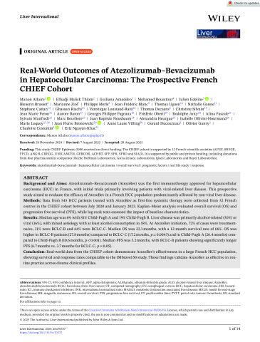Résumé : Background and Aims Atezolizumab–Bevacizumab (AtezoBev) was the first immunotherapy approved for hepatocellular carcinoma (HCC) in France, with initial trials primarily involving patients with viral‐related liver disease. This prospective study aimed to evaluate the efficacy of AtezoBev in a French HCC population predominantly affected by non‐viral liver disease. Methods Data from 545 HCC patients treated with AtezoBev as first‐line systemic therapy were collected from 32 French centres in the CHIEF cohort between July 2020 and January 2023. Kaplan–Meier analysis evaluated overall survival (OS) and progression‐free survival (PFS), while log‐rank tests assessed the impact of baseline characteristics. Results Median age was 69, with 81% Child‐Pugh A and 19% Child‐Pugh B. Liver disease was primarily alcohol‐related (30%) or viral (16%), with mixed aetiology with at least alcohol consumption in 58%. At AtezoBev initiation, 72% of cases were treatment‐naive, 31% were BCLC‐B and 64% were BCLC‐C. Median OS was 23.1 months, with a 12‐month survival rate of 66%. OS was higher in BCLC‐B patients (27.8 months) compared to BCLC‐C (17.2 months, p = 0.0043) and in Child‐Pugh A (26.4 months) compared to Child‐Pugh B (10.6 months, p < 0.001). Median PFS was 5.2 months, with BCLC‐B patients showing significantly longer PFS (6.7 months vs. 3.7 months for BCLC‐C, p = 0.05). Conclusion Real‐world data from the CHIEF cohort demonstrate AtezoBev's effectiveness in a large French HCC population, showing survival and response rates comparable to the IMbrave150 study. These findings validate AtezoBev as effective in routine practice across diverse clinical profiles.