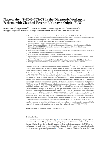 Résumé : Objective: To explore the diagnostic contribution of the 18F-FDG-PET/CT in a population of patients with classical fever of unknown origin (FUO), to pinpoint its place in the diagnostic decision tree in a real-life setting, and to identify the factors associated with a diagnostic 18F-FDG-PET/CT.Method: All adult patients (aged ≥ 18 years) with a diagnosis of classical FUO who underwent an 18F-FDG-PET/CT in the University Hospital of Montpellier (France) between April 2012 and December 2017 were included. True positive 18F-FDG-PET/CT, which evidenced a specific disease causing FUO, were considered to be contributive.Results: Forty-four patients with FUO have been included (20 males, 24 females; mean age 57.5 ± 17.1 years). Diagnoses were obtained in 31 patients (70.5%), of whom 17 (38.6%) had non-infectious inflammatory diseases, 9 had infections (20.5%), and 3 had malignancies (6.8%). 18F-FDG-PET/CT was helpful for making a final diagnosis (true positive) in 43.6% of all patients. Sensitivity and specificity levels were 85% and 37%, respectively. A total of 135 investigations were performed before 18F-FDG-PET/CT, mostly CT scans (93.2%) and echocardiography (59.1%), and 108 after 18F-FDG-PET/CT, mostly biopsies (including the biopsy of a temporal artery) (25%) and MRIs (34%). In multivariate analysis, the hemoglobin level was significantly associated with a helpful 18F-FDG-PET/CT (p = 0.019, OR 0.41; 95% CI (0.20–0.87)), while the CRP level was not associated with a contributive 18F-FDG-PET/CT.Conclusion: 18F-FDG-PET/CT may be proposed as a routine initial non-invasive procedure in the diagnostic workup of FUO, especially in anemic patients who could be more likely to benefit from 18F-FDG-PET/CT.