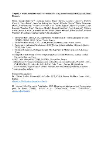 Résumé : Background: Vaptans were developed at the end of the previous century as V2R antagonists. Tolvaptan is the most prescribed vaptan for hyponatremia and the autosomal polycystic kidney disease (ADPKD). However, its use is not as widespread as it should be due to price issues, a narrow therapeutic window and some side effects. With the aim of discovering new efficient and safer V2R antagonists, we screened animal venoms and identified several interesting peptide toxins. Among them, MQ1 displayed such unique biological properties in that regard that it was the starting point for the development of a potential drug candidate. Methods: Human T-cell assays and bioinformatics was used to mitigate MQ1 immunogenicity risk. The MQ232 biodistribution in mice was done by positron emission tomography (PET). Pharmacodynamics, pharmacokinetics, acute and chronic toxicity tests were performed on control rats. A rat experimental model of dDAVP-induced hyponatremia, an ex vivo mice model of renal cysts and a mice orthologous model of ADPKD were used to validate MQ232 efficacy in these pathologies. Results: Three mutations were introduced in MQ1 to mitigate its immunogenicity risk. A fourth gain-of-function mutation was added to generate MQ232. MQ232's safety was demonstrated by a first toxic dose as high as 3,000 nmol/kg and a strong kidney organ selectivity by PET imaging, while showing almost no interaction with the liver. MQ232's efficacy was first demonstrated with an effective dose of 3 nmol/kg in a hyponatremic model, and then in polycystic kidney models on which MQ232 significantly reduced cyst growth. Conclusions: We demonstrated, employing diverse translational techniques and minimizing animal use, MQ232's safety and efficacy in several rodent models of hyponatremia and ADPKD.