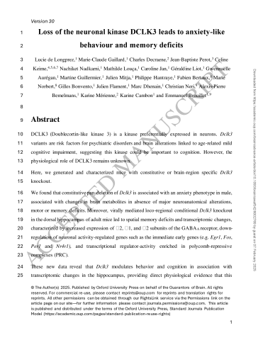 Résumé : DCLK3 (Doublecortin-like kinase 3) is a kinase preferentially expressed in neurons. Dclk3 variants are risk factors for psychiatric disorders and brain alterations linked to age-related mild cognitive impairment, suggesting this kinase could be important to cognition. However, the physiological role of DCLK3 remains unknown. Here, we generated and characterized mice with constitutive or brain-region specific Dclk3 knockout. We found that constitutive pan-deletion of Dclk3 is associated with an anxiety phenotype in male, associated with changes in brain metabolites in absence of major neuroanatomical alterations, motor or memory deficits. Moreover, virally mediated loco-regional conditional Dclk3 knockout in the dorsal hippocampus of adult mice led to spatial memory deficits and transcriptomic changes, characterized by increased expression of α2, β1, and β2 subunits of the GABAA receptor, down-regulation of neuronal activity-regulated genes such as the immediate early genes (e.g. Egr1, Fos, Per1 and Nr4r1), and transcriptional regulator-activity enriched in polycomb-repressive complexes (PRC). These new data reveal that Dclk3 modulates behavior and cognition in association with transcriptomic changes in the hippocampus, providing direct physiological evidence that this kinase is involved in synaptic plasticity, consistent with its crucial role in neurodegenerative and psychiatric diseases.
