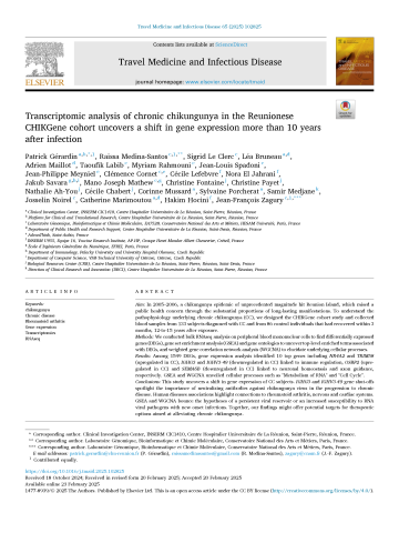 Résumé : In 2005-2006, a chikungunya epidemic of unprecedented magnitude hit Reunion Island, which raised a public health concern through the substantial proportions of long-lasting manifestations. To understand the pathophysiology underlying chronic chikungunya (CC), we designed the CHIKGene cohort study and collected blood samples from 133 subjects diagnosed with CC and from 86 control individuals that had recovered within 3 months, 12-to-15 years after exposure.We conducted bulk RNAseq analysis on peripheral blood mononuclear cells to find differentially expressed genes (DEGs), gene set enrichment analysis (GSEA) and gene ontologies to uncover top-level enriched terms associated with DEGs, and weighted gene correlation network analysis (WGCNA) to elucidate underlying cellular processes.Among 1549 DEGs, gene expression analysis identified 10 top genes including NR4A2 and TRIM58 (upregulated in CC), IGHG3 and IGHV3-49 (downregulated in CC) linked to immune regulation, OSBP2 (upregulated in CC) and SEMA6B (downregulated in CC) linked to neuronal homeostasis and axon guidance, respectively. GSEA and WGCNA unveiled cellular processes such as "Metabolism of RNA" and "Cell Cycle”.This study uncovers a shift in gene expression of CC subjects. IGHG3 and IGHV3-49 gene shut-offs spotlight the importance of neutralizing antibodies against chikungunya virus in the progression to chronic disease. Human diseases associations highlight connections to rheumatoid arthritis, nervous and cardiac systems. GSEA and WGCNA bounce the hypotheses of a persistent viral reservoir or an increased susceptibility to RNA viral pathogens with new onset infections. Together, our findings might offer potential targets for therapeutic options aimed at alleviating chronic chikungunya.