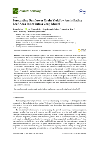 Résumé : Forecasting sunflower grain yield a few weeks before crop harvesting is of strategic interest for cooperatives that collect and store grains. With such information, they can optimize their logistics and thus reduce the financial and environmental costs of grain storage. To provide these predictions, data assimilation approaches involving the crop model SUNFLO are used. The methods are based on the re-estimation of soil conditions and on the sequential update of crop model states using an ensemble Kalman filter. They combine the simulation of the crop model and time series of leaf area index (LAI) derived from remote sensors and extracted over 281 fields near Toulouse, France. A sensitivity analysis is used to identify the most relevant model inputs to consider into the data assimilation process. Results show that data assimilation leads to statistically significant better predictions than the simulation alone (from an RMSE of 9.88 q.ha(-1) to an RMSE 7.49 q.ha(-1)). Significant improvement is achieved by relying on smoothed LAI rather than raw LAI. Nevertheless, there is still an over estimation of the grain yield that can be partially explained by the limiting factors observed on the fields and the forecast yield still need improvements to meet the required applications' accuracy.
