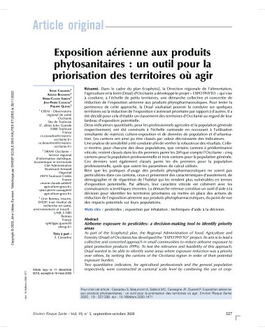 Résumé : Dans le cadre du plan Ecophyto2, la Direction régionale de l’alimentation, l’agriculture et la for^et (Draaf) d’Occitanie a développé le projet « EXPO’PHYTO » qui vise à conduire, à l’échelle de petits territoires, une démarche collective et concertée de réduction de l’exposition aérienne aux produits phytopharmaceutiques. Pour tester la pertinence de cette approche, la Draaf souhaitait pouvoir la conduire sur quelques territoires où la réduction de l’exposition s’avérerait prioritaire par rapport à d’autres. Il a été décidé pour cela d’établir un classement des territoires d’Occitanie au regard de leur fardeau d’exposition potentielle. Deux indicateurs quantitatifs, pour les professionnels agricoles et la population générale respectivement, ont été construits à l’échelle cantonale en recourant à l’utilisation simultanée de matrices culture-exposition et de données de population et d’urbanisa- tion. Les cantons ont ainsi pu ^etre classés par valeur décroissante des indicateurs. Une analyse de sensibilité a été conduite afin de vérifier la robustesse des résultats. Celle- ci montre, pour chacune des deux populations, que certains cantons à prédominance viticole, restent classés dans les dix premiers parmi les 269 que compte l’Occitanie : cinq cantons pour la population professionnelle et trois cantons pour la population générale. Ces derniers sont également classés parmi les dix premiers pour la population professionnelle, quels que soient les paramètres de calcul utilisés. Bien que les pratiques d’usage des produits phytopharmaceutiques ne soient pas particulières dans ces cantons, ceux-ci présentent des caractéristiques d’assolement, de démographie et de répartition de l’habitat qui les rendent plus vulnérables en termes d’exposition potentielle. Par ailleurs, leur caractère viticole est cohérent avec les connaissances scientifiques récentes. La démarche retenue constitue un outil d’aide à la décision pour identifier les territoires prioritaires où mettre en place des actions de réduction de l’exposition aérienne aux produits phytopharmaceutiques, du point de vue des impacts potentiels sur leurs populations.