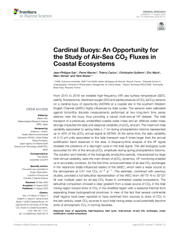 Résumé : From 2015 to 2019 we installed high-frequency (HF) sea surface temperature (SST), salinity, fluorescence, dissolved oxygen (DO) and partial pressure of CO 2 (pCO 2) sensors on a cardinal buoy of opportunity (ASTAN) at a coastal site in the southern Western English Channel (sWEC) highly influenced by tidal cycles. The sensors were calibrated against bimonthly discrete measurements performed at two long-term time series stations near the buoy, thus providing a robust multi-annual HF dataset. The tidal transport of a previously unidentified coastal water mass and an offshore water mass strongly impacted the daily and seasonal variability of pCO 2 and pH. The maximum tidal variability associated to spring tides (>7 m) during phytoplankton blooms represented up to 40% of the pCO 2 annual signal at ASTAN. At the same time, the daily variability of 0.12 pH units associated to this tidal transport was 6 times larger than the annual acidification trend observed in the area. A frequency/time analysis of the HF signal revealed the presence of a day/night cycle in the tidal signal. The diel biological cycle accounted for 9% of the annual pCO 2 amplitude during spring phytoplankton blooms. The duration and intensity of the biologically productive periods, characterized by large inter-annual variability, were the main drivers of pCO 2 dynamics. HF monitoring enabled us to accurately constrain, for the first-time, annual estimates of air-sea CO 2 exchanges in the nearshore tidally-influenced waters of the sWEC, which were a weak source to the atmosphere at 0.51 mol CO 2 m −2 yr −1. This estimate, combined with previous studies, provided a full latitudinal representation of the WEC (from 48 • 75 N to 50 • 25 N) over multiple years for air-sea CO 2 fluxes in contrasted coastal ecosystems. The latitudinal comparison showed a clear gradient from a weak source of CO 2 in the tidal mixing region toward sinks of CO 2 in the stratified region with a seasonal thermal front separating these hydrographical provinces. In view of the fact that several continental shelf regions have been reported to have switched from sources to sinks of CO 2 in the last century, weak CO 2 sources in such tidal mixing areas could potentially become sinks of atmospheric CO 2 in coming decades.