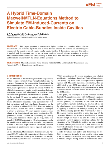 Résumé : This paper proposes a time-domain hybrid method for coupling Multiconductor-Transmission-Line Network equations and a Finite Element Method to evaluate the electromagnetic response of the electric wires of a cable-bundle located inside a 3 dimensional structure. The method is applied and demonstrated over a box structure made of several volumes containing a realistic multiconductor cable-harness and illuminated by a plane wave. The formalism of the method is given and the results obtained show the interest of this approach.