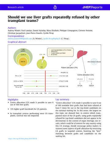 Résumé : Background & aims: In France, liver grafts that have been refused at least 5 times can be "rescued" and allocated to a centre which chooses a recipient from its own waiting list, outside the patient-based allocation framework. We explored whether these "rescued" grafts were associated with worse graft/patient survival, as well as assessing their effect on survival benefit. Methods: Among 7,895 candidates, 5,218 were transplanted between 2009 and 2014 (336 centre-allocated). We compared recipient/graft survival between patient allocation and centre allocation, considering a selection bias and the distribution of centre-allocation recipients among the transplant teams. We used a propensity score approach and a weighted Cox model using the inverse probability of treatment weighting method. We also explored the survival benefit associated with centre-allocation grafts. Results: There was a significantly higher risk of graft loss/death in the centre allocation group compared to the patient allocation group (hazard ratio 1.13; 95% CI 1.05-1.22). However, this difference was no longer significant for teams that performed more than 7% of the centre-allocation transplantations. Moreover, receiving a centre-allocation graft, compared to remaining on the waiting list and possibly later receiving a patient-allocation graft, did not convey a poorer survival benefit (hazard ratio 0.80; 95% CI 0.60-1.08). Conclusions: In centres which transplanted most of the centre-allocation grafts, using grafts repeatedly refused for top-listed candidates was not detrimental. Given the organ shortage, our findings should encourage policy makers to restrict centre-allocation grafts to targeted centres. Lay summary: "Centre allocation" (CA) made it possible to save 6 out of 100 available liver grafts that had been refused at least 5 times for use in the top-listed candidates on the national waiting list. In this series, the largest on this topic, we showed that, in centres which transplanted most of the CA grafts, using grafts repeatedly refused for top-listed candidates did not appear to be detrimental. In the context of organ shortage, our results, which could be of interest for any country using this CA strategy, should encourage policy makers to reassess some aspects of graft allocation by restricting CA grafts to targeted centres, fostering the "best" matching between grafts and candidates on the waiting list.