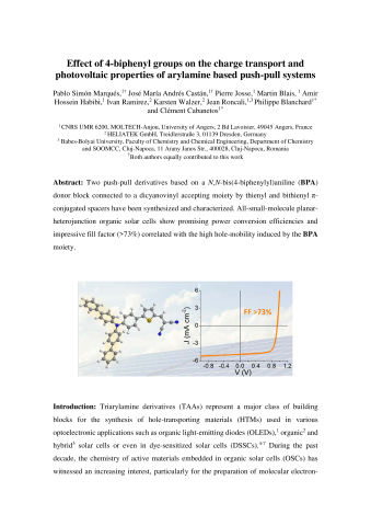Résumé : The synthesis of two N , N -bis(4-biphenylyl)aniline (BPA) based push–pull is reported herein. Evaluation as donor materials in all-small-molecule planar-heterojunction organic solar cells lead to impressive fill factor (>73%) and promising power conversion efficiencies.