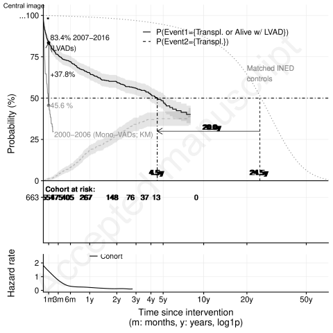 Résumé : OBJECTIVES: Our goal was to provide a picture of left ventricular assist device (LVAD) activity in France between 2007 and 2016 based on the multicentric ASSIST-ICD registry.METHODS: We retrospectively collected 136 variables including in-hospital data, follow-up survival rates and adverse events from 671 LVAD recipients at 20 out of 24 LVAD implant centres in France. The average follow-up time was 1.2 years (standard deviation: 1.4); the total follow-up time was 807.5 patient-years.RESULTS: The included devices were the HeartMate II®, HeartWare LVAS® or Jarvik 2000®. The overall likelihood of being alive while on LVAD support or having a transplant (primary end point) at 1, 2, 3 and 5 years postimplantation was 65.2%, 59.7%, 55.9% and 47.7%, respectively, given a cumulative incidence of 29.2% of receiving a transplant at year 5. At implantation, 21.5% of patients were on extracorporeal life support. The overall rate of cardiogenic shock at implantation was 53%. The major complications were driveline infection (26.1%), pump pocket or cannula infection (12.6%), LVAD thrombosis (12.2%), ischaemic (12.8%) or haemorrhagic stroke (5.4%; all strokes 18.2%), non-cerebral haemorrhage (9.1%) and LVAD exchange (5.2%). The primary end point (survival) was stratified by age at surgery and by the type of device used, with inference from baseline profiles. The primary end point combined with an absence of complications (secondary end point) was also stratified by device type.CONCLUSIONS: The ASSIST-ICD registry provides a real-life picture of LVAD use in 20 of the 24 implant centres in France. Despite older average age and a higher proportion of patients chosen for destination therapy, survival rates improved compared to those in previous national registry results. This LVAD registry contrasts with other international registries because patients with implants have more severe disease, and the national policy for graft attribution is distinct. We recommend referring patients for LVAD earlier and suggest a discussion of the optimal timing of a transplant for bridged patients (more dismal results after the second year of support?).