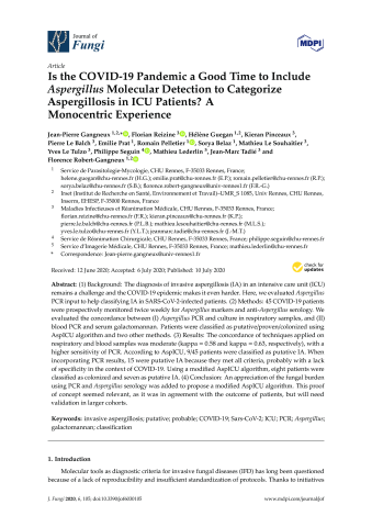 Résumé : Background The diagnosis of invasive aspergillosis (IA) in an intensive care unit (ICU)remains a challenge and the COVID-19 epidemic makes it even harder. Here, we evaluatedAspergillus PCR input to help classifying IA in SARS-CoV-2-infected patients.Methods 45COVID-19 patients were prospectively monitored twice weekly for Aspergillus markers and anti-Aspergillus serology. We evaluated the concordance between (Ι) Aspergillus PCR and culture inrespiratory samples, and (ΙΙ) blood PCR and serum galactomannan. Patients were classified asputative/proven/colonized using AspICU algorithm and two other methods.Results Theconcordance of techniques applied on respiratory and blood samples was moderate (kappa = 0.58and kappa = 0.63, respectively), with a higher sensitivity of PCR. According to AspICU, 9/45 patientswere classified as putative IA. When incorporating PCR results, 15 were putative IA because theymet all criteria, probably with a lack of specificity in the context of COVID-19. Using a modifiedAspICU algorithm, eight patients were classified as colonized and seven as putative IA.Conclusion An appreciation of the fungal burden using PCR and Aspergillus serology was addedto propose a modified AspICU algorithm. This proof of concept seemed relevant, as it was inagreement with the outcome of patients, but will need validation in larger cohorts.