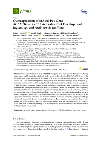 Résumé : Until recently, the roles of plant MADS-box genes have mainly been characterized during inflorescence and flower dierentiation. In order to precise the roles of AGAMOUS-LIKE 12, one of the few MADS-box genes preferentially expressed in roots, we placed its cDNA under the control of the double 35S CaMV promoter to produce transgenic walnut tree and Arabidopsis plants. In Juglans sp., transgenic somatic embryos showed significantly higher germination rates but abnormal development of their shoot apex prevented their conversion into plants. In addition, a wide range of developmental abnormalities corresponding to ectopic root-like structures aected the transgenic lines suggesting partial reorientations of the embryonic program toward root dierentiation. In Arabidopsis, AtAGL12 overexpression lead to the production of faster growing plants presenting dramatically wider and shorter root phenotypes linked to increased meristematic cell numbers within the root apex. In the upper part of the roots, abnormal cell divisions patterns within the pericycle layer generated large ectopic cell masses that did not prevent plants to grow. Taken together, our results confirm in both species that AGL12 positively regulates root meristem cell division and promotes overall root vascular tissue formation. Genetic engineering of AGL12 expression levels could be useful to modulate root architecture and development.