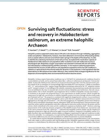 Résumé : Halophilic proteins subjected to below about 15% salt in vitro denature through misfolding, aggregation and/or precipitation. Halobacteria, however, have been detected in environments of fluctuating salinity such as coastal salterns and even around fresh water springs in the depths of the Dead Sea. In order to identify the underlying mechanisms of low salt survival, we explored the reactivation capacity of Halobacterium (Hbt) salinarum sub-populations after incubation in low salt media and recovery in physiological salt. Respiratory oxygen consumption was assessed in stressed cells and cell viability was estimated by Live/Dead staining and flow cytometry. In vivo neutron scattering experiments showed that the recovery of Hbt salinarum sub-populations exposed to severe low salt conditions is related to a rapid retrieval of functional molecular dynamics in the proteome. In the hypothesis that the observations on Hbt salinarum have wider relevance, they could be of key ecological significance for the dispersion of extremophiles when environmental fluctuations become severe.