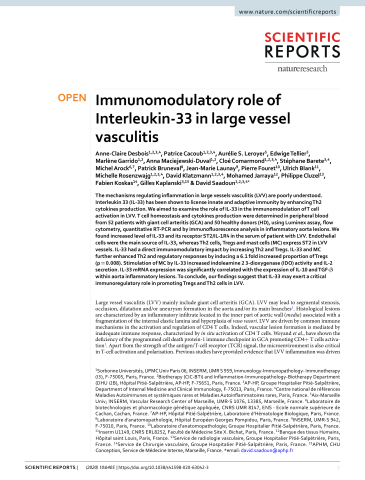 Résumé : The mechanisms regulating inflammation in large vessels vasculitis (LVV) are poorly understood. Interleukin 33 (IL-33) has been shown to license innate and adaptive immunity by enhancing Th2 cytokines production. We aimed to examine the role of IL-33 in the immunomodulation of T cell activation in LVV. T cell homeostasis and cytokines production were determined in peripheral blood from 52 patients with giant cell arteritis (GCA) and 50 healthy donors (HD), using Luminex assay, flow cytometry, quantitative RT-PCR and by immunofluorescence analysis in inflammatory aorta lesions. We found increased level of IL-33 and its receptor ST2/IL-1R4 in the serum of patient with LVV. Endothelial cells were the main source of IL-33, whereas Th2 cells, Tregs and mast cells (MC) express ST2 in LVV vessels. IL-33 had a direct immunomodulatory impact by increasing Th2 and Tregs. IL-33 and MC further enhanced Th2 and regulatory responses by inducing a 6.1 fold increased proportion of Tregs (p = 0.008). Stimulation of MC by IL-33 increased indoleamine 2 3-dioxygenase (IDO) activity and IL-2 secretion. IL-33 mRNA expression was significantly correlated with the expression of IL-10 and TGF-β within aorta inflammatory lesions. To conclude, our findings suggest that IL-33 may exert a critical immunoregulatory role in promoting Tregs and Th2 cells in LVV.