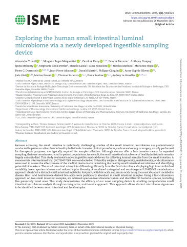 Résumé : Because accessing the small intestine is technically challenging, studies of the small intestinal microbiome are predominantly conducted in patients rather than in healthy individuals. Invasive clinical procedures, such as endoscopy or surgery, usually performed for therapeutic purposes, are typically required for sample collection. Although stomas offer a less invasive means for repeated sampling, their use remains restricted to patient populations. As a result, the small intestinal microbiome of healthy individuals remains largely understudied. This study evaluated a novel ingestible medical device for collecting luminal samples from the small intestine. A monocentric interventional trial (NCT05477069) was conducted on 15 healthy subjects. Metagenomics, metabolomics, and culturomics were used to assess the effectiveness of the medical device in characterizing the healthy small intestinal microbiome and identifying potential biomarkers. The small intestinal microbiota differed significantly from the fecal microbiota, displaying high inter-individual variability, lower species richness and reduced alpha diversity. A combined untargeted and semi-targeted LC-MS/MS metabolomics approach identified a distinct small intestinal metabolic footprint, with bile acids and amino acids being the most abundant metabolite classes. Host-and host/microbe-derived bile acids were particularly abundant in small intestinal samples. Using a fast culturomics approach on two small intestinal samples, we achieved species-level characterization and identified 90 bacterial species, including five potentially novel ones. This study demonstrates the efficacy of our novel sampling device in enabling comprehensive small intestinal microbiome analysis through an integrative, multi-omics approach. This approach allows distinct microbiome signatures to be identified between small intestinal and fecal samples.