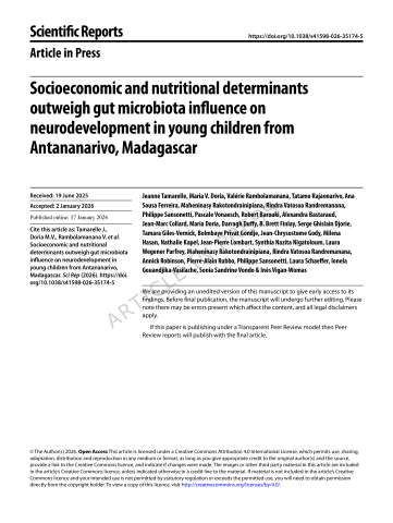 Résumé : In 2024, stunted child growth affected 150 million children under the age of five years, underscoring its critical impact on global health. Stunting has also been associated with neurodevelopmental delays. This study explores the relationship between stunting, the fecal microbiota, and neurodevelopment in 2–5-year-old children from the Afribiota cross-sectional study in Madagascar. Children were assessed using the Ages and Stages Questionnaire (ASQ-3), covering five developmental domains (communication, personal-social, problem-solving, fine and gross motor). Fecal samples were analyzed via 16S rRNA gene amplicon sequencing. Classical bi- and multivariate analysis was combined with Structural Equation Modelling to evaluate direct and indirect associations between different clinical factors, the microbiota and neurodevelopment. Our study shows that stunting and low socioeconomic status are consistently linked to poorer neurodevelopmental outcomes, while low branched-chain amino acids and hemoglobin levels are associated with stunting. Furthermore, a higher microbial diversity within individuals (α-diversity—specifically the Shannon index-) was directly linked to improved neurodevelopment scores in one of the tested models, while gut microbiota variation between individuals (β-diversity) was not associated with neurodevelopment. These findings support the hypothesis of neurodevelopment being primarily influenced by nutritional and social factors, with a more limited role for microbiota diversity.
