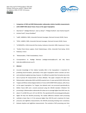 Résumé : Accurate knowledge of the relative humidity (RH) in the troposphere is important for predicting cloud formation, particularly in the upper troposphere where contrails can form and contribute to global warming. However, it is difficult to predict their formation due to the lack of precise RH measurements at these altitudes. This paper compares RH data from Meteomodem radiosondes (M10 and M20) acquired over a 5-years period (2020-2024) at the Trappes and Nîmes meteorological stations in France with ECMWF ERA5 analyses, with a focus on the upper troposphere. For Trappes, two datasets exist: one processed operationally by Météo France (MF) and a second processed using the GRUAN standard. Whatever the processing is, Meteomodem radiosondes RH values are on average higher than ERA5 ones, by about 2 % at 800 hPa up to 10 % at 200 hPa. The operational MF processing generally gives higher RH than the GRUAN processing. The median difference between both processing methods is lower than 2.2 % for pressures higher than 300 hPa and is maximum for lower pressures and nighttime measurements, the GRUAN processing showing more consistency between daytime and nighttime measurements. The evolution of MF processing over time.