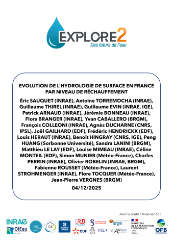 Résumé : Ce rapport est une des synthèses des résultats obtenus pour la recharge potentielle des aquifères et les débits. Un rapport spécifique aux évolutions des niveaux piézométriques complète l’analyse réalisée ici. Ce document fait suite aux rapports sur les impacts climatiques examinés par niveau de réchauffement publiés par Météo France. Les analyses réalisées portent sur les recharges annuelles, les débits annuels et saisonniers, le régime hydrologique décrit par les variations des douze débits mensuels moyens, et deux caractéristiques des extrêmes : un débit d’étiage et un débit de crue. L’ensemble résume leurs évolutions au travers de cartes et de tableaux de synthèse. Les réponses à trois grands types d’évolution climatique possibles pour une France à +4°C illustrent les incertitudes.