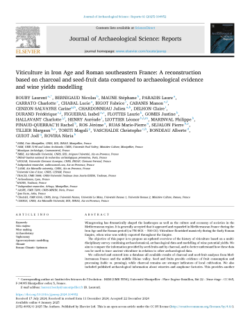Résumé : Winegrowing has dramatically shaped the landscapes as well as the culture and economy of societies in the Mediterranean region. It is generally accepted that it appeared and expanded in Mediterranean France during the Iron Age and the Roman period (ca 750 BCE − 500 CE). Viticulture flourished massively during the Early Roman Empire, when wine was widely exported throughout the Empire. The objective of this paper is to propose an updated overview of the history of viticulture based on a multidisciplinary survey combining archaeobotanical, archaeological data and modelling of wine potential yields. We aim to compare the information provided by seed-fruits and by charcoal, and to better understand how these data can be used to trace ancient viticulture in relation to other archaeological data. We collected and entered into a database all available results of charcoal and seed-fruit analyses from Mediterranean France and the middle Rhône valley. Seed and fruits provide evidence of fruit consumption and processing (table vs. pressing), while charcoal remains are stronger indicators of local cultivation. We also included published archaeological information about wineries and amphorae factories. This provides another way of identifying areas of cultivation and processing into wine, and gives hints on the scale of production and the possible destination for export. The reconstructions based on the multi-proxy information contained in the database are compared to the climate-vegetation LPJmL model estimates of wine potential yields and their variations over space and time. Charcoal and seed evidence concur to show that viticulture started in the 6th-5th c. BCE and developed with the progressive increase of potential wine yields throughout the Iron Age and then with the Roman Climatic Optimum. In the Roman period, the development of specialised winemaking facilities provides impressive evidence of viticulture, but is at the same time less favourable to its record by archaeobotany. Apparently, charcoals and seeds are more frequently preserved in rubbish assemblages when winemaking activities are still associated with domestic activities. While wineries and amphorae factories bear witness to a wine crisis in the Late Roman period, archaeobotanical remains indicate that viticulture persisted, probably in a less specialised mode, and modelling suggests that potential wine yields did not decline in comparison with the heyday of regional viticulture. Archaeobotany also provides consistent evidence of the existence of grapevine cultivation in urban Roman contexts.