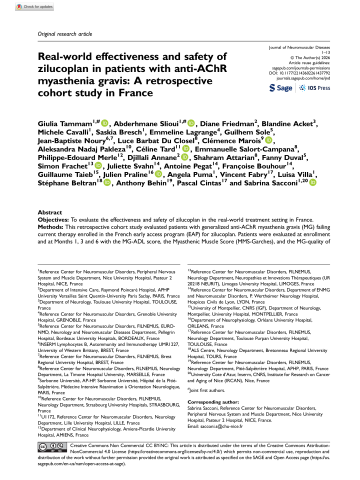 Résumé : ObjectivesTo evaluate the effectiveness and safety of zilucoplan in the real-world treatment setting in France.MethodsThis retrospective cohort study evaluated patients with generalized anti-AChR myasthenia gravis (MG) failing current therapy enrolled in the French early access program (EAP) for zilucoplan. Patients were evaluated at enrollment and at Months 1, 3 and 6 with the MG-ADL score, the Myasthenic Muscle Score (MMS-Garches), and the MG-quality of life questionnaire (MG-QoL15r). MG crises and on-treatment adverse events were documented. MG medication use was compared between the six months before and after enrollment.ResultsForty-eight patients were enrolled and treated with zilucoplan (mean age: 56.2 years; 50.9% men). Thirty patients achieved six months follow-up before the EAP ended. Three patients discontinued zilucoplan due to lack of efficacy. Mean MG-ADL score decreased from 7.4 ± 4.4 to M0 to 2.5 ± 2.7 at M6 (p < 0.0001). 9/43 patients achieved minimal symptom expression at M3 and 12/30 at M6. Mean MMS-Garches score was 67.5 ± 20.0 at M0 and 87.5 ± 13.2 at M6 (p < 0.0001). Mean MG-QoL15r score was 18.2 ± 8.6 at M0 and 8.7 ± 8.3 at M6 (p = 0.0156). 15 patients experienced adverse events, leading to discontinuation in four cases. The mean oral corticosteroid dose decreased from 28.8 ± 11.8 mg to 17.9 ± 11.8 (p = 0.001). Six patients experienced MG crises on treatment, compared to 22 in the six months preceding enrollment. treatment.DiscussionFollowing initiation of zilucoplan treatment, we observed an improvement in MG symptoms and a reduction in MG crises and in exposure to oral corticosteroids. Overall, zilucoplan was well-tolerated with no major adverse events reported.Trial registration informationThe study was registered in the clinicaltrials.gov trial registry under the number NCT06815133 (https://clinicaltrials.gov/study/NCT06815133) on February 4th, 2025.