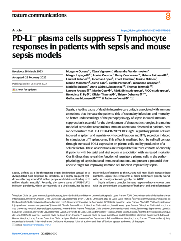Résumé : Sepsis, a leading cause of death in intensive care units, is associated with immune alterations that increase the patients’ risk of secondary infections and mortality, so better understandings of the pathophysiology of sepsis-induced immunosuppression is essential for the development of therapeutic strategies. In a murine model of sepsis that recapitulates immune alterations observed in patients, here we demonstrate that PD-L1