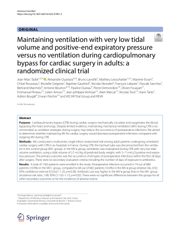 Résumé : Purpose: Cardiopulmonary bypass (CPB) during cardiac surgery mechanically circulates and oxygenates the blood, bypassing the heart and lungs. Despite limited evidence, maintaining mechanical ventilation (MV) during CPB is recommended, as ventilator strategies during surgery may reduce the occurrence of postoperative infections. We aimed to determine whether maintaining MV for cardiac surgery would decrease postoperative infections compared with stopping MV during CPB.Methods: We conducted a multicenter, single-blind, randomized trial among adult patients undergoing scheduled cardiac surgery with CPB in six hospitals in France. During CPB, the tracheal tube was disconnected from the ventilator in the control group (MV- group). In the MV + group, ventilation was maintained during CPB with very low tidal volume ventilation, using a tidal volume of 2.5 mL/kg of predicted body weight, with 5-7 cmH2O positive end expiratory pressure. The primary outcome was the occurrence of all types of postoperative infections within the first 28 days after surgery. There were six secondary evaluation criteria including the number of days of exposure to antibiotics.Results: A total of 1362 patients were enrolled in the study. Postoperative infection occurred in 74 out of 680 patients (10.9%) in the MV- group, compared to 68 out of 682 patients (10.0%) in the MV + group (relative risk, 0.92; 95% confidence interval [CI] 0.67-1.25; p = 0.58). Antibiotic use was higher in the MV + group than in the MV- group (incidence risk ratio, 1.08; 95% CI 1.02-1.15; p = 0.02). There were no significant differences between the groups for all other secondary outcomes or for the incidence of adverse events.Conclusions: Maintaining very low tidal volume ventilation with positive end-expiratory pressure during CPB did not reduce postoperative infections at 28 days compared to when mechanical ventilation was stopped during CPB. An unexpectedly higher use of antibiotics was observed when ventilation was maintained.Trial registration: ClinicalTrials.gov (NCT03372174)