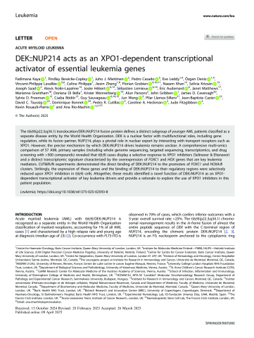 Résumé : The t(6;9)(p22.3;q34.1) translocation/DEK::NUP214 fusion protein defines a distinct subgroup of younger AML patients classified as a separate disease entity by the World Health Organization. DEK is a nuclear factor with multifunctional roles, including gene regulation, while its fusion partner, NUP214, plays a pivotal role in nuclear export by interacting with transport receptors such as XPO1. However, the precise mechanism by which DEK::NUP214 drives leukemia remains unclear. A comprehensive multi-omics comparison of 57 AML primary samples (including whole genome sequencing, targeted sequencing, transcriptomics, and drug screening with >500 compounds) revealed that t(6;9) cases display a selective response to XPO1 inhibitors (Selinexor & Eltanexor) and a distinct transcriptomic signature characterized by the overexpression of FOXC1 and HOX genes that are key leukemia mediators. CUT&RUN experiments demonstrated the direct binding of DEK::NUP214 to the promoters of FOXC1 and HOXA/B clusters. Strikingly, the expression of these genes and the binding of DEK::NUP214 to their regulatory regions were selectively reduced upon XPO1 inhibition in t(6;9) cells. Altogether, these results identified a novel function of DEK::NUP214 as an XPO1-dependent transcriptional activator of key leukemia drivers and provide a rationale to explore the use of XPO1 inhibitors in this patient population.