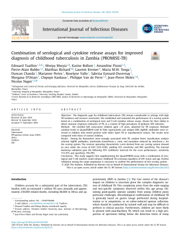 Résumé : Objectives: The diagnostic gaps for childhood tuberculosis (TB) remain considerable in settings with high TB incidence and resource constraints. We established and evaluated the performance of a scoring system based on a combination of serological tests and T-cell cytokine release assays, chosen for their ability to detect immune responses indicative of TB, in a context of high prevalence of pediatric HIV infection. Methods: We enrolled 628 consecutive children aged ≤15 years, admitted for TB suspicion. Multiple cytokine levels in QuantiFERON Gold In-Tube supernatants and antigen 85B (Ag85B) antibodies were assessed in children who tested positive with either Xpert TB or mycobacterial culture. The results were compared with those of control children. Results: Among the biomarkers most strongly associated with TB, random forest classification analysis selected Ag85B antibodies, interleukin-2/interferon-γ ratio, and monokine induced by interferon-γ for the scoring system. The receiver operating characteristic curve derived from our scoring system showed an area under the curve of 0.95 (0.91-0.99), yielding 91% sensitivity and 88% specificity. The internal bootstrap validation gave the following 95% confidence intervals for the score performance: sensitivity 71%-97% and specificity 79%-99%. Conclusions: This study suggests that supplementing the QuantiFERON assay with a combination of serological and T-cell markers could enhance childhood TB screening regardless of HIV status and age. Further validation among the target population is necessary to confirm the performance of this scoring system.