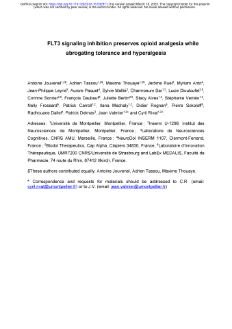 Résumé : Opioid analgesia is counteracted on chronic use by tolerance and hyperalgesia inducing dose escalation and life-threatening overdoses. Mu opiate receptors (MOR) expressed in primary sensory neurons were recently found to control tolerance and hyperalgesia, but the underlying mechanisms remained elusive. Here we show that genetic inactivation of fms -like tyrosine kinase receptor 3 (FLT3) receptor in sensory neurons abrogates morphine tolerance and hyperalgesia by preventing MOR-induced hyperactivation of the cAMP signaling pathway and subsequent excitatory adaptive processes. Moreover, the specific FLT3 inhibitor BDT001 potentiates morphine analgesia in acute and chronic pain models, without aggravating morphine adverse effects, and reverses tolerance and hyperalgesia once installed. Thus, FLT3 appears as a key regulator of the MOR signaling pathway and its pharmacological blockade shows promise to enhance chronic opioid analgesic efficacy.