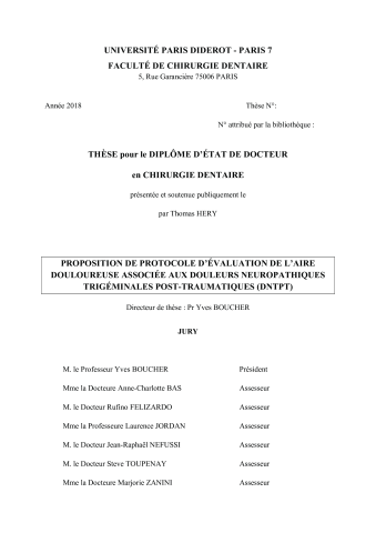 Résumé : Un essai clinique évaluant l’efficacité des injections de BTX-A chez les patients souffrant de DNTPT va être démarré prochainement dans le service d’odontologie du GHPS (projet TRIGTOX, investigateur principal : Pr BOUCHER). Cliniquement, l’efficacité de la procédure sera testée par des questionnaires d’évaluation de la douleur tels que DN4 (Douleur Neuropathique en 4 Questions) et QCD (Questionnaire Concis d’évaluation de la Douleur), ainsi que par des mesures d’évaluation sensorielle quantitative (QST) ; seront également évaluées la fréquence des crises douloureuses et l’aire douloureuse. Il n’existe pas actuellement de protocole standardisé de calcul d’une surface douloureuse, mais de nombreuses méthodes développées individuellement par différents groupes de recherche. Après une revue de la littérature analysant les méthodes utilisées pour l’évaluation des douleurs utilisées dans d’autres essais cliniques, comme les neuropathiques spinales ou les myalgies trigéminales, nous tenterons de proposer une méthodologie d’évaluation de l’aire douloureuse lors de DNTPT, adaptée à l’environnement cutané extra-buccal et muqueux intra-buccal, utilisable au cours de l’essai TRIGTOX et pouvant servir de standard pour d’autres projets similaires. Cette proposition est basée sur les outils d’imagerie et les logiciels de numérisation.