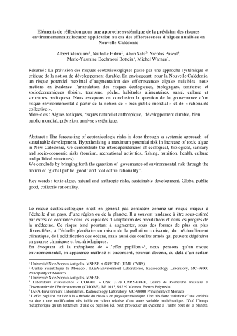 Résumé : La prévision des risques écotoxicologiques passe par une approche systémique et critique de la notion de développement durable. En envisageant, pour la Nouvelle Calédonie, un risque potentiel maximal d'augmentation des efflorescences algales nuisibles, nous mettons en évidence l'articulation des risques écologiques, biologiques, sanitaires et socioéconomiques (loisirs, tourisme, pêche, habitudes alimentaires, santé, culture et structures politiques). Nous évoquons en conclusion la question de la gouvernance d'un risque environnemental à partir de la notion de « bien public mondial » et de « rationalité collective ».