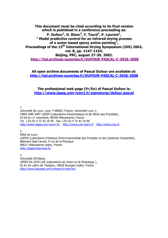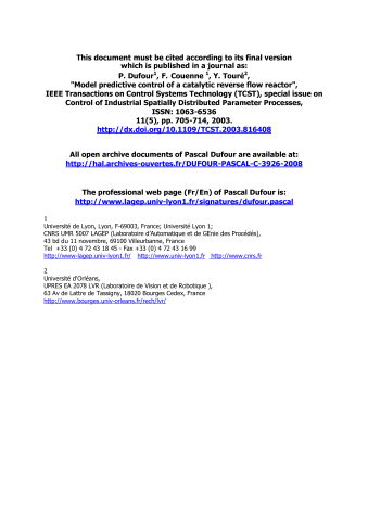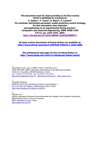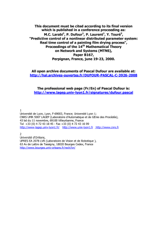 Résumé : It is now recognized that model predictive control (MPC) is an interesting alternative for real-time control of industrial processes. In the meantime, some problems do still remain in progress: for theoretical aspects, the a priori guarantee of the stability and for the practical aspects, the guarantee of sufficient time to solve to optimization problem at each sampled time positions. In this paper, we propose a global method that aims to reduce the on-line calculation time due to the PDE model based optimization task resolution. It is addressed for a particular class of systems not very often studied in this context: systems described by partial differential equations (PDEs) which are, in the present case, nonlinear and parabolic. In order to decrease the computational burden, the nonlinear PDE system is solved off-line. Then, a linearized PDE model around the previous off-line behavior is used to find the optimal variations for the on-line predictive control. The real-time control application given is concerned with a infrared drying process of painting film.